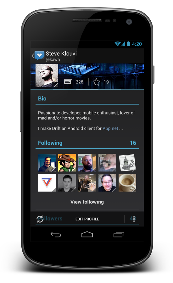 Drift is a client for App.net* social network. It is carefully deisgned to be simple, clean yet delightful.